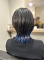 初めてもブリーチとインナーカラーです。上部は黒で染めて、インナーは2回のブリーチです。しっかり黄色くらいに抜いてから青が好ましい。というのは彩度と言って鮮やかさのある青は中途半端に抜くと濁った色になるからです。