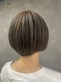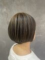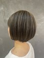 カットは襟足が短めのショートボブで、サイドは顎とリップラインの間くらいに設定してあります。カラーはトップをブリーチでぬいたアンブレラカラーで、アッシュ系の色味を足しました。