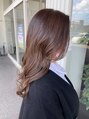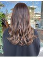 カットはロングの長さでカットしのカラーは赤みを消して透明感を出しています。全体を32ミリのコテで巻き表面の毛は動きが出るよう少し細かく巻いています。スタイリング剤はオイルを少しつけてウェット感を出しています。