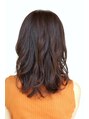 レイヤーをいれ、パーマで動きをつけたスタイルです。毛先と中間をスパイラルで巻いて束が重ならないようにしています。前髪は斜めに流れるように切り、カラーは暖かみのあるチョコレートブラウンをチョイス。トーンは7レベルの配色となっています。