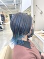 ウルフスタイルのブルーカラーのデザインカラー襟足のみ2回ブリーチでターコイズ、上は前回のハイライトを活かして全体に濃い青をいれてハイライトをブルーに襟足の長さは残してウルフヘアーに