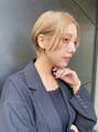カーテンバングのハンサムショート。ブリーチ2回して色を抜いた後にベージュ系カラーでオンカラー。まっすぐにして丸み感を出すのがスタイリングポイント。