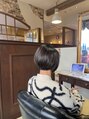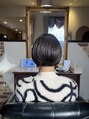 前下がりベースのショートボブは、襟足がスッキリする事でシャープな仕上がりに。顔まわりはボブっぽく、丸みもあるので、伸びてきても重くなりにくいです。