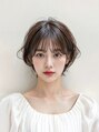 - いわき/メンズライク ミルクティーアッシュ ハイトーンカラー 前髪パーマ ぱっつん前髪 ボブパーマ