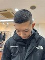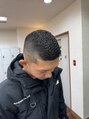 横後ろ0.3mm~始まるグラデーション刈り上げ、フェードカット。トップの長さも鋏で切れる限界の短さまでカットし、アイロンで熱パーマを当てて、セットしなくても動きが出るようにしています。