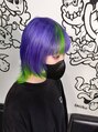 カットで段がはいっているのでインナーカラーで黄緑をいれてもエンドカラーにも見える原色デザインスタイルです。前髪はメッシュ風にポイントで黄緑が入ってます