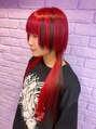 全体をレッドに染めてポイントに黒のメッシュをエクステでつけました。襟足メインにエクステをつけてロングウルフに仕上げています。