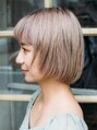 顔まわりにレイヤーを入れたハイトーンなショートボブです。後ろから見ると重たいですが、前上がりで顔まわりに段が入っているので前から見ると重たく見えません。前髪もワイドで広めですが、眉上レングスなのでスッキリして見えます。