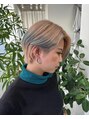 ホワイトベージュに深めのブルーを毛先に入れたデザインカラーです。カットは前髪長めのハンサムショートです。