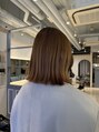 伸ばし中の切りっぱなしボブ肩のに当たって跳ねやすくなる長さなのであえて外ハネスタイリングにしましたそうすると気にする事なく伸ばしていけますカラーはダブルカラーの透明感upベージュ系で仕上げました