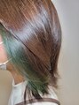 ミディアムレイヤー。明るめのイノアカラーに、アクセントカラーとしてグリーンのインナーカラーを組み合わせ。インナーカラーは一度ブリーチで脱色後にヘアマニキュアを被せてビビッドに。