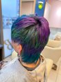 ショートレイヤーにカラフルなカラーをオンしたクレイジーショートですスタイリングはワックスでハードに動かしてもよし、オイル系スタイリングでウエット仕上げもカッコよくておすすめです!