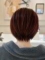 前下がりのショートボブスタイルです。ボリュームが出やすい髪質なのでしっかり減らしてタイトに収めています。
