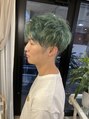少しくすみのあるグリーンカラーがおしゃれなメンズスタイルです。2回ブリーチしてしっかり明るさを出してからオンカラーすることで透明感のある色味に表現しています。