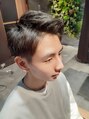 カットサイド、えり足刈り上げ、トップにレイヤーを入れ束感がでるようにカットし前髪はアップバングに