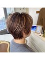コンパクトで収まりの良いショートにする為に襟足はイングラをつけて内側を少し短くするようにカットしています。5ミリ間隔の中細ハイライトを表面に施して、ナチュラルピンクブラウンで色持ちよく
