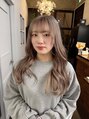 透明感あふれるグレージュカラーです。柔らかな色味が顔色を明るく見せ、落ち着きながらも華やかな印象を与えます。このスタイルは、ブリーチを活用した透明感が特徴で、ゆるやかなウェーブと合わせることでフェミニンさを引き立てます。
