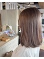 ツヤ感たっぷりのシルキーベージュ。シルエットはパツンと切りっぱなしミディ。甘さもあり大人感も楽しめるスタイルです。