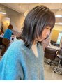 顔周りに段差をつけたミディアムのスタイル。姫カットにならないようなバランスで顔まわりにポイントを作ります。結んだ時のおくれ毛にも。