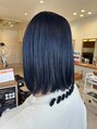 ブルーブラック/ネイビー/ブリーチ/ダブルカラー/切りっぱなしボブ/オージュア深めのブルーで抜け方も綺麗なカラーです!オージュアのケアでノンアイロンでもツヤツヤに!