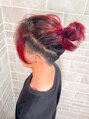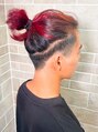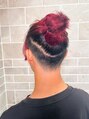 下部が刈り上がってツーブロックになったマンバンヘアで、バレイヤージュ状にブリーチして赤髪に。マンバンはバレイヤージュとの相性が良い。