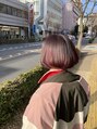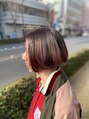 段なしワンレングスボブ。厚みを減らすために、2ブロックで中の方を一周刈り上げてます。カラーは根本を外して1度ブリーチ、その後イルミナカラーの暗めのレッド系で全体を染めてます。