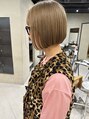 切りっぱなしボブでミニボブに近いくらいスッキリしてます。ベージュベースの柔らかい透明感カラーです。少しピンクも混ざっているピンクベージュです。色が抜けてもグレージュになります。髪質改善トリートメントで収まりもサラサラですたっぷりハイライト