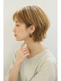 顔まわりに軽さを出しつつ、後頭部に自然な丸みが出るようカットされたショートレイヤーが動きを生み、軽やかで上品な印象に。前髪は目にかかる長さで、横に流してフェミニンさを演出。カラーは透明感のあるベージュ系で、肌なじみよく大人っぽさも◎