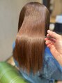 レゾカラー&メテオトリートメント。レゾカラーで頭皮に優しくカラーをしてメテオトリートメントで大人女性の悩みの一つであるエイジング毛と言われるパサつきを抑えサラ艶に導きます。カラーはスモーキートパーズで脱白髪染め。