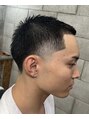 サイドパートのスキンフェードにパーマをかけて動きを出したスタイルです!セットはジェルを髪全体に馴染ませ、手櫛で前髪を立ち上げ斜め後ろに流して完成です!