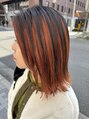 ブリーチしたベースに、表面は暗めのグレーを入れて、内側はオレンジを入れたアンブレラカラー◯切りっぱなしにぴったりなスタイルで、コテで軽く外ハネにして、オイルをさらっとつけるだけでいいスタイルです!