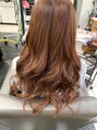 人気のダブルカラー。全体的にバレイヤージュで明るくします。その上からレッドオレンジ系のカラーを塗布した。オシャレで人気のカラーです。全体的にメリハリがつくので巻いた時にとても動くが綺麗に見えます。是非、お試しください
