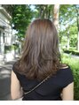 重さと軽やかさを両立させたミディアムレイヤースタイル。顔周りの流れる前髪と、下の方で揺れる低めのレイヤーのバランスが、大人の品と、女性らしさのある雰囲気に。明るめのベージュカラーで重たい印象になりすぎないようにしています。