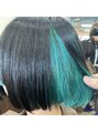ちらっと見えるライトブルーのインナーカラーがきれい☆黒髪とのコントラストとも相性抜群です!ただのボブじゃ終わらない個性派スタイル♪