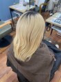 元々明るいベースを活かし、ほんのりピンクを感じるピンクグレージュに。根元の地毛をリタッチし、全体に髪質改善を混ぜたカラー剤をのせています。顔まわりのレイヤーとマッチさせた今っぽいスタイルに仕上げています。