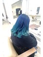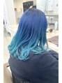 グラデーション状に濃いブルーからエメラルドグリーンにしたデザインカラー毛先に残留が残ってる場合やダメージで毛先のブリーチをこれ以上すると危ない場合などはできる色味でデザインのカラーに生かすのもおすすめです