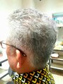 シルバーグレーがダンディなお客様。トップは強めのパーマでふんわりし、周りはハサミで刈り上げてます。全体に柔らかな好印象です。