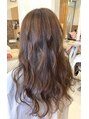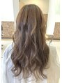 胸下ロングローレイヤーのゆるふわパーマヘア。9トーン・シアベージュカラーで透明感のある仕上がりに。サイエンスアクアを重ね、コテ巻きもツヤのある柔らかい質感に。