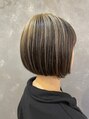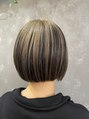 カットは襟足ギリギリのボブで、毛量調整してあります。カラーは、地毛をベースにトップにブリーチでハイライトを入れ、黄色味を抑えるように上からアッシュを被せました。