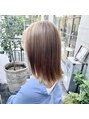 しっかりと量感調整をした軽やかな切っぱなしスタイル。カラーは明るめのベージュブラウンの中に、ブリーチのハイライトを細かく入れ込み、明るい中でもコントラストが出るカラーになっています。
