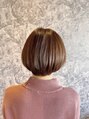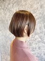 王道の丸みショートに透明感のあるベージュカラーで女性らしい柔らかい質感をだしました。普通のボブより襟足まわりがタイトに収まるので軽く見せたい方や表面、顔まわりに動きの欲しい方に特におすすめです。スタイリングはワンカール巻いてオイルでOK。