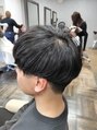 トップは動きをつけて量感調節。全体的には長さを残して少し軽くして。スタイリングはクリームワックスとジェルを1対1で混ぜて揉み込んで簡単スタイリング。