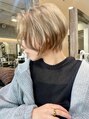 カーテンバングのハンサムショート。ブリーチ2回して色を抜いた後にベージュ系カラーでオンカラー。前髪を立ち上げてs字感を出すのがスタイリングポイント。