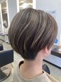 もみあげと襟足は刈り上げてスッキリと大人かっこいいショートスタイルにしました。カラーはダークトーンのベースにブリーチでハイライトを入れています、ひと月前に紫色のカラーを入れて色落ちした状態です。綺麗にホワイトベージュに退色しました。