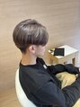 長めの前髪を センターで分けたスタイルです。カラーはアディクシーカラーのグレージュ系