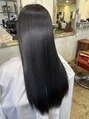 ブルーブラックのカラーと髪質改善トリートメント赤みが出ず、透明感のあるイフリートカラーのブラックとマリアージュブルーで綺麗なブルーブラックに美髪矯正をしているので、質感回復の髪質改善トリートメントで絹髪復活