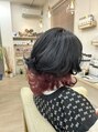 肩上辺り長さミディアムオクトパスラウンドウルフレイヤースタイルです☆カラーリングでアンダーセクションブリーチ後ボルドールビーをトップディープブルーをグローバルミルボン髪質改善トリートメントで立体感ある手触り良い潤艶な大人女性美髪スタイルに☆