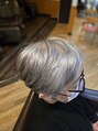 ベーシックなショートのカットに白髪の多さを活かしてグレイッシュなヘアマニキュアをしています。新しい毛が生えてきても気にならずマニキュアのハリコシ、ツヤも出て良いことずくめのスタイルです。