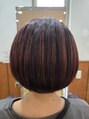 襟足ギリギリのショートボブ重く見えないよう裾にかけてグラデーションと軽さを。レッド系のにヴェール感をミックスしたカラーです。