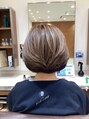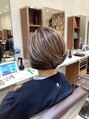 襟足ぎりぎりののレングスでやや前下がりのグラデーションボブスタイルです。ワンレングスより丸みがあるので綺麗に内巻きになりやすいです。カラーは表面にハイライトが入る事で躍動感が出ます。ナチュラルドライで OKです。
